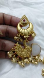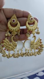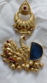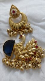Dive into timeless opulence with this majestic piece featuring a crescent-shaped golden stud and rich royal blue center between two carved peacocks. Finished with ghungroo beads for traditional effect.