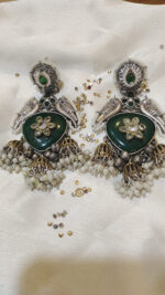 Adorn yourself with the unique charm of these mixed metal jhumka earrings with a green stone. Perfect for adding a touch of bohemian elegance or vintage-inspired flair to any occasion. Experience the Jalwaa Gems artistry and embrace the allure of uniquely designed, handcrafted jewelry.