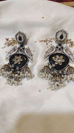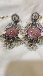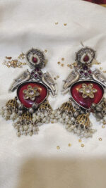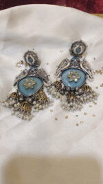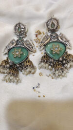 Immerse yourself in the captivating blend of textures and tones with Jalwaa Gems’ latest design: exquisite jhumka earrings featuring a serene green stone and mixed metal accents.