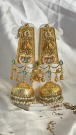 These are elaborate statement Jhumka earrings with a rectangular or elongated top and a traditional bell-shaped (jhumka) pendant. They showcase a blend of intricate detailing, colorful stones, and pearl accents. Adorn yourself with these stunning gold-toned Jhumka earrings featuring intricate engravings, light blue stones, and pearl accents.