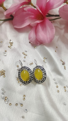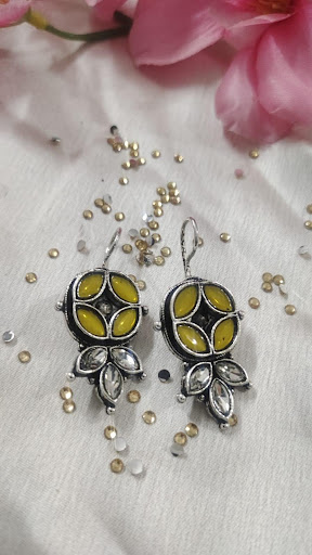 Original price was: ₹135.00.₹105.00Current price is: ₹105.00.Silver-Toned Drop Earrings with Yellow and Clear Accents